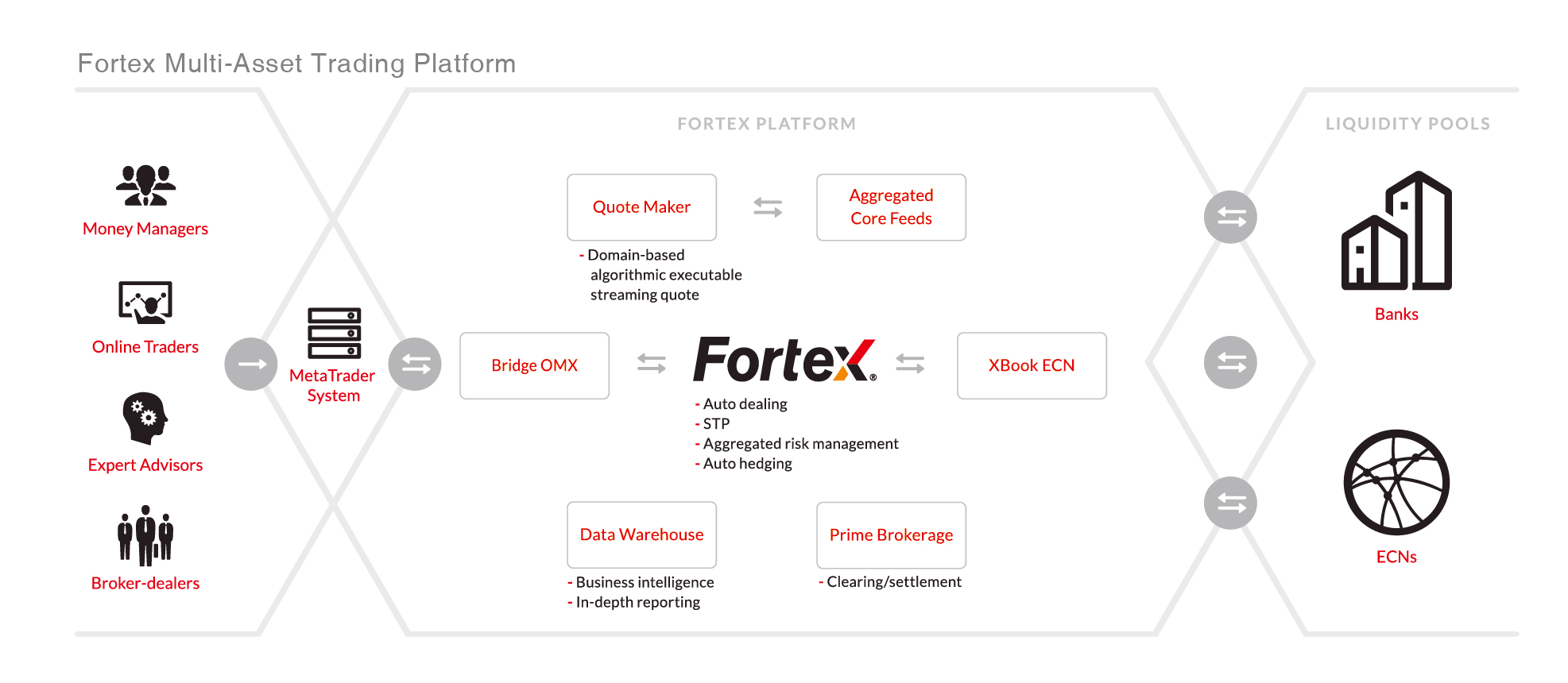 Fortex Bridge OMX is middleware that integrates the MetaTrader trading system with the Fortex platform for unifying global execution venues and aggregating segmented liquidity pools.